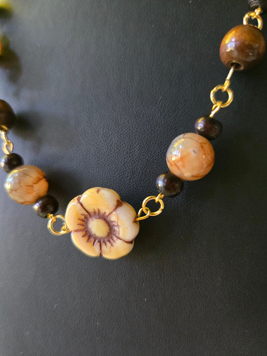 Autumn Glow Beaded Necklace with Sandy Jade Flower