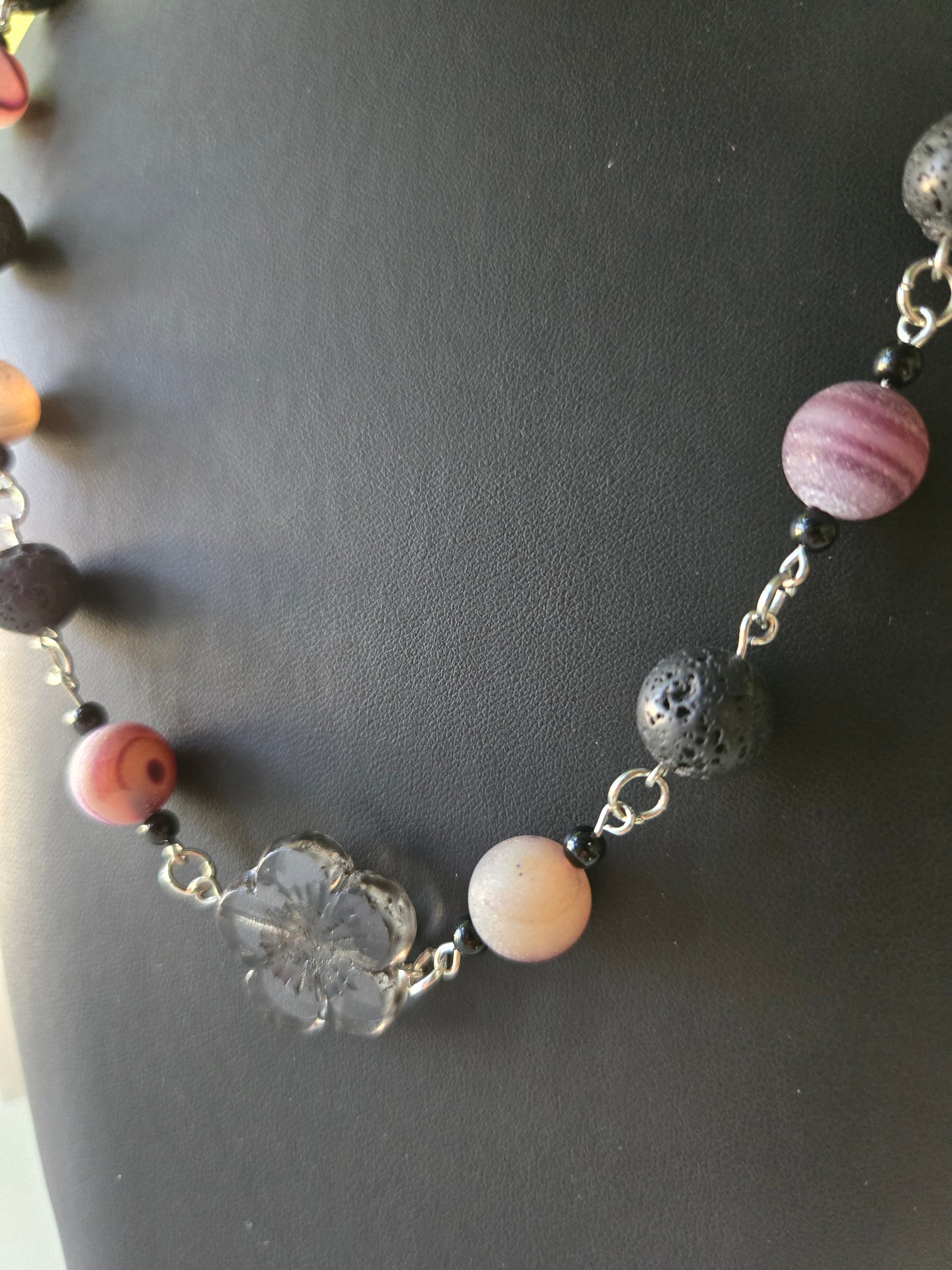 Materials: frosted agate, lava stone, glass pendant, silver-plated links