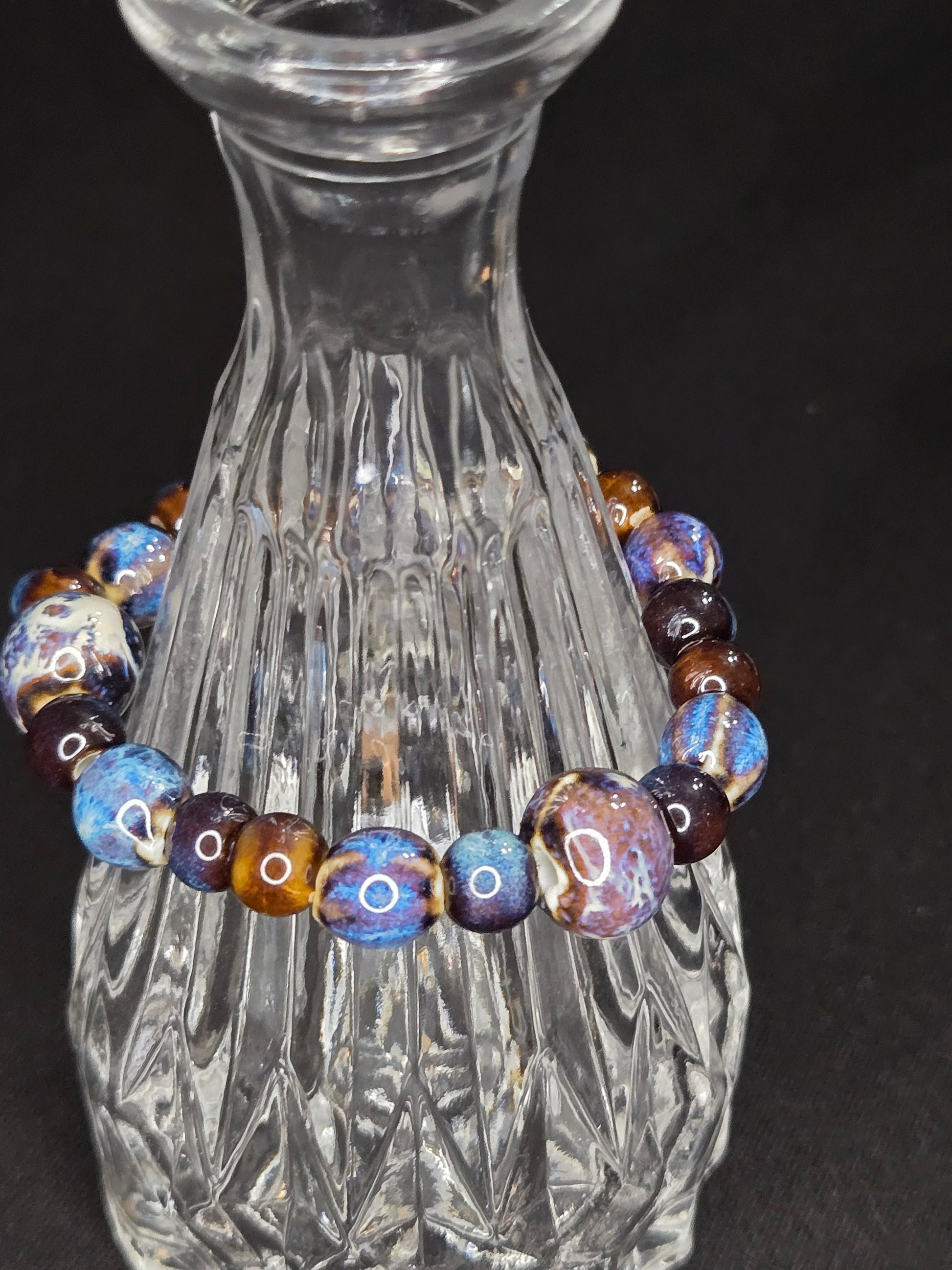 The Celestial Drift Bracelet feels like holding a fragment of the night sky—ceramic beads glazed in deep indigo, violet, and cream tones swirl like distant galaxies against dark wooden accents. Each bead is uniquely marbled, carrying its own quiet cosmos, grounded by the warmth of the earth.
