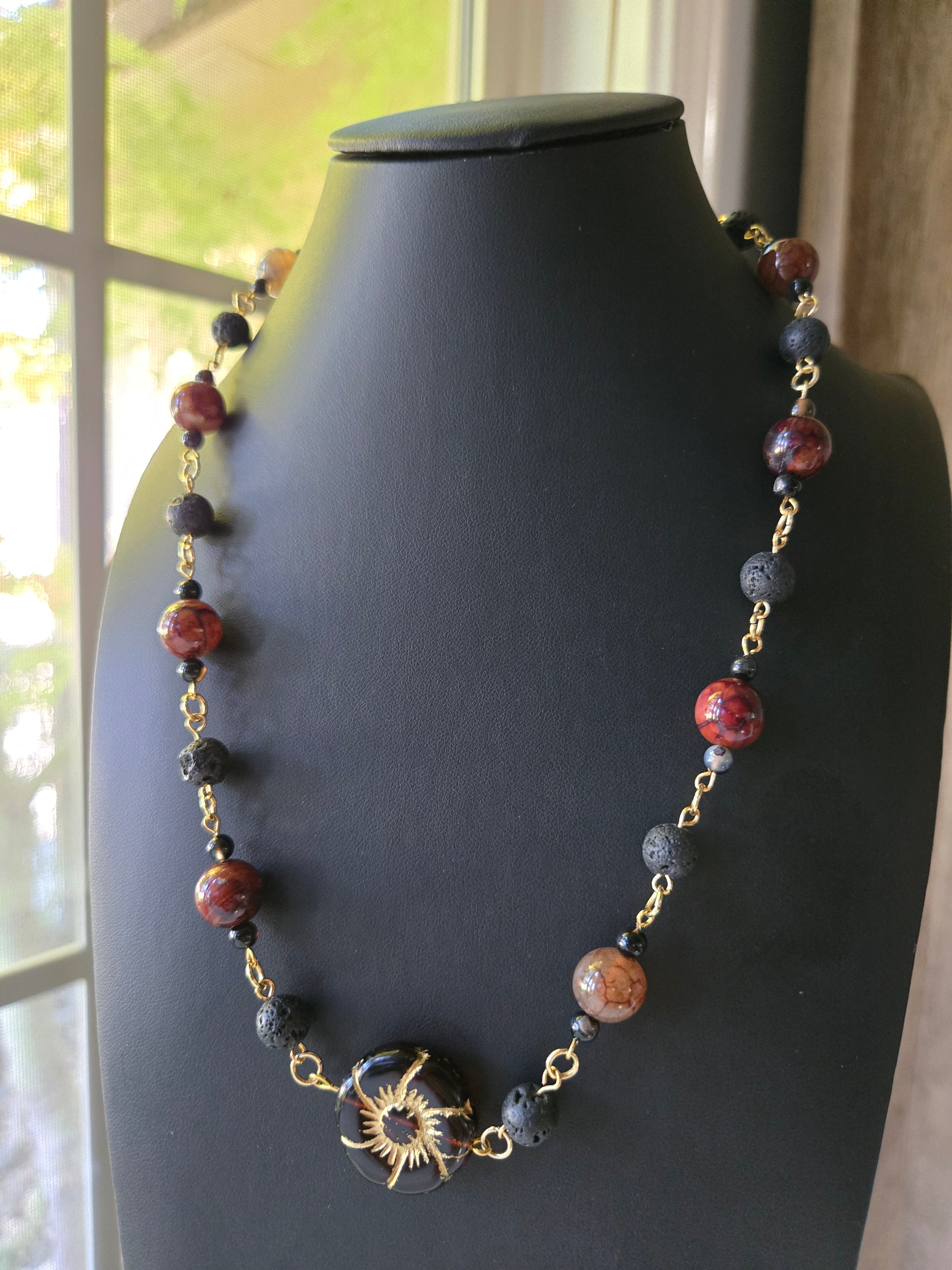 The Solar Vein Necklace radiates with deep, ember-toned warmth and elemental contrast. Glossy fire-agate beads and raw black lava stones weave together through golden links, drawing the eye toward a striking sunburst pendant — a dark glass disc veined with molten gold.