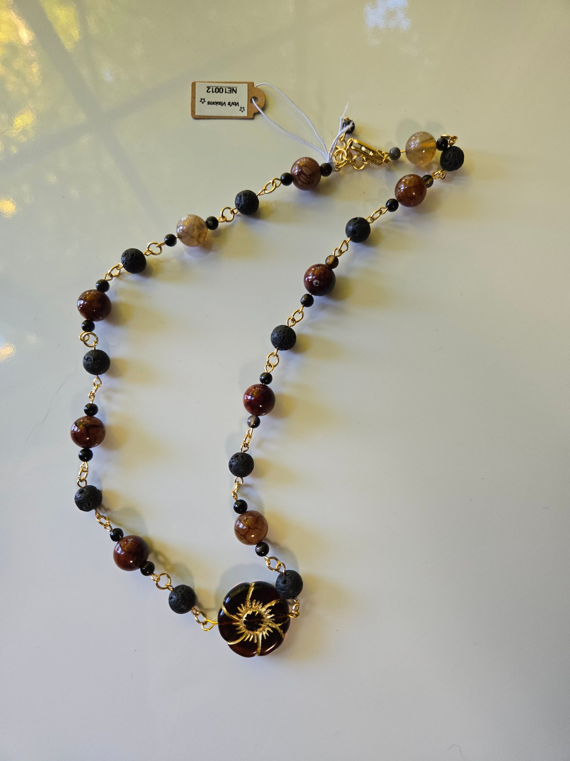 Materials: Fire agate, lava stone, gold-plated wire, glass sun pendant